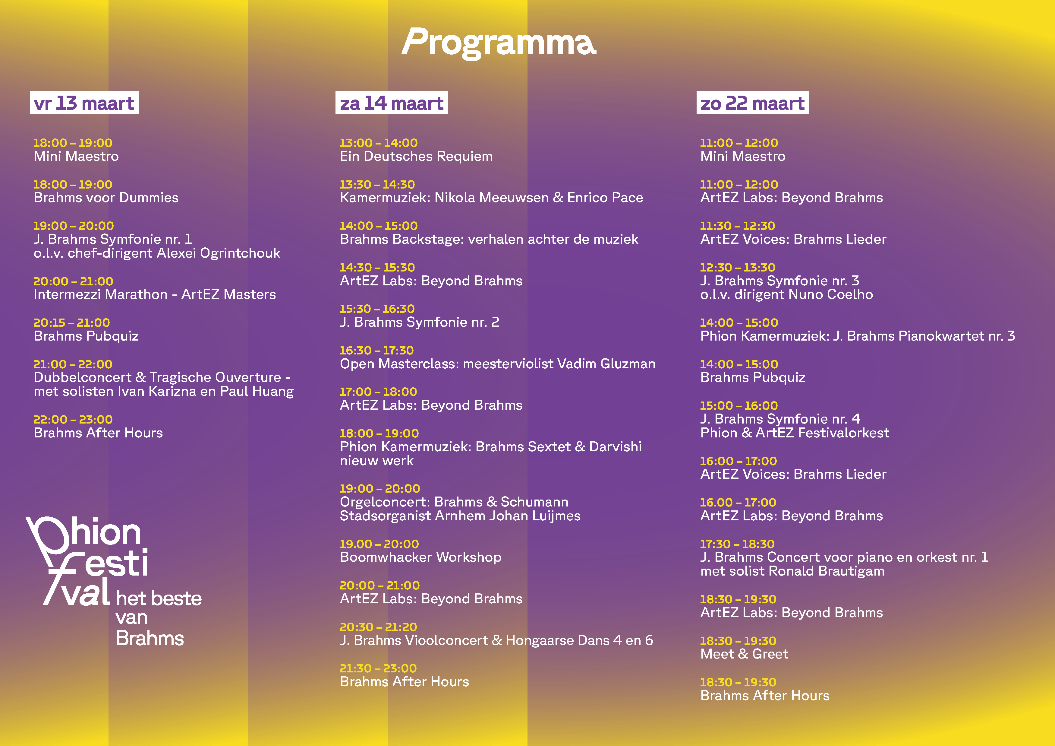 Daarnaast presenteert Orkest Phion fantastische kamermuziekwerken en een keur aan gerenommeerde solisten. Zo speelt Ronald Brautigam het Eerste Pianoconcert, Vadim Gluzman het Vioolconcert en treden Pau Huang en Ivan Karizna gezamenlijk aan in het Dubbelconcert voor viool en cello.