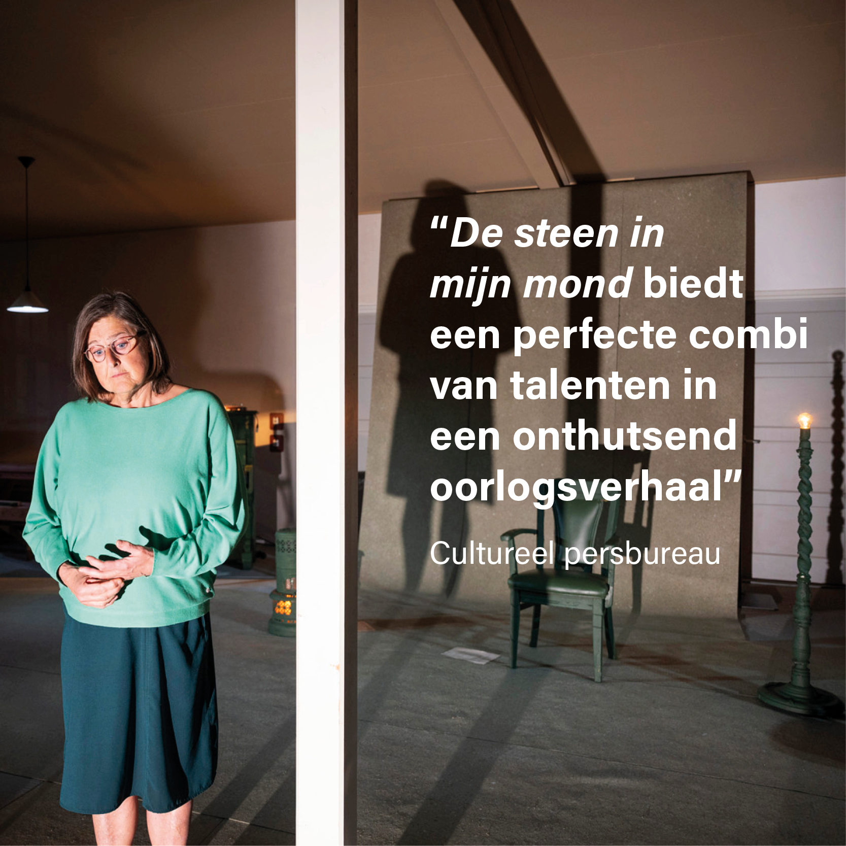De steen in mijn mond is een aangrijpende voorstelling geïnspireerd op het verhaal van het Eindhovense meisje Marietje tijdens de Tweede Wereldoorlog. Ze was negen toen de oorlog begon, ze was veertien toen het zuiden van Nederland werd bevrijd. In die paar jaar voltrok er zich een groot drama in haar gezin, waarna haar leven nooit meer hetzelfde zou zijn.